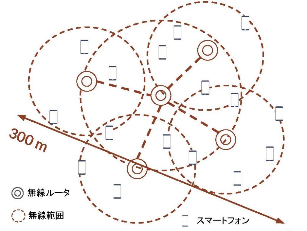Dots forの通信インフラは、従来の基地局を中心としたスター型ネットワークとは異なり、複数の無線ルータを経由して分散的にデータを送信する分散型の無線ネットワーク技術を採用しています。サーバ、ルータ、バッテリーボックスをソーラーパネルに接続するだけで、迅速かつ低コストでインフラを整備できるのが特長です。